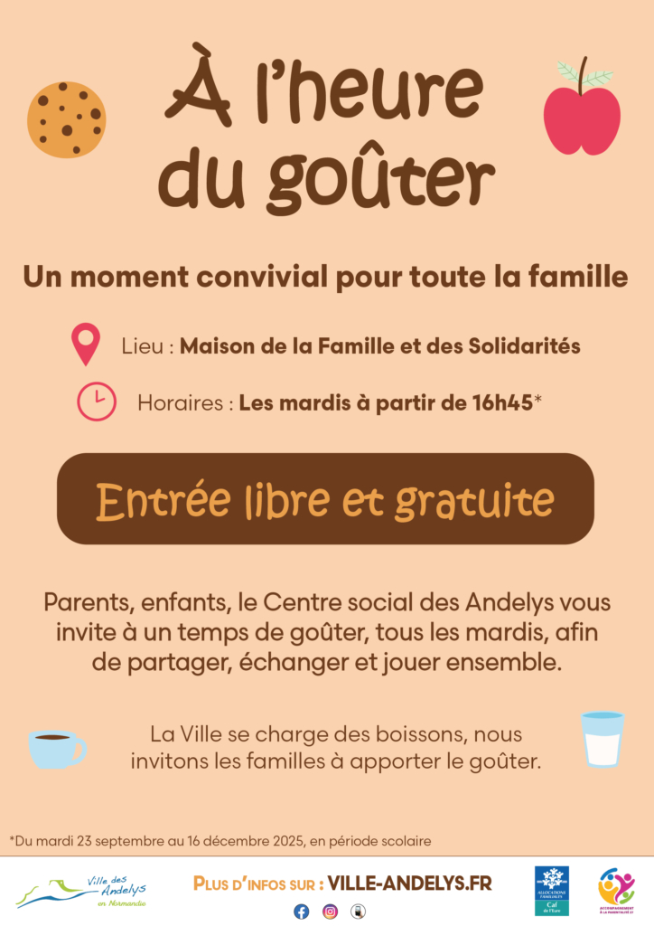 | FreeTous les mardis à partir de 16h45 à la Maison de la Famille et des Solidarités, le Centre social des Andelys vous propose de partager un moment convivial pour toute la famille autour d’un gouter.