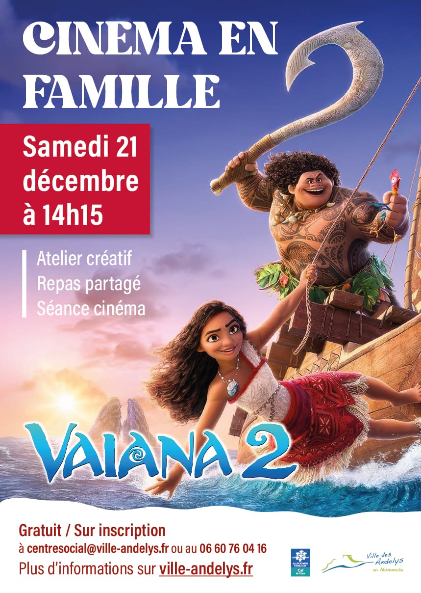 Enfants, parents et grands-parents, venez assister gratuitement à la projection du dessin animé Disney, « Vaiana 2 », samedi 21 décembre à 14h15.