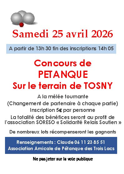 | 5€Samedi 25 avril à partir de 14h05 sur le terrain de Tosny, l’association l’Amicale des Trois Lacs vous propose un tournoi de pétanque à la mêlée tournante.