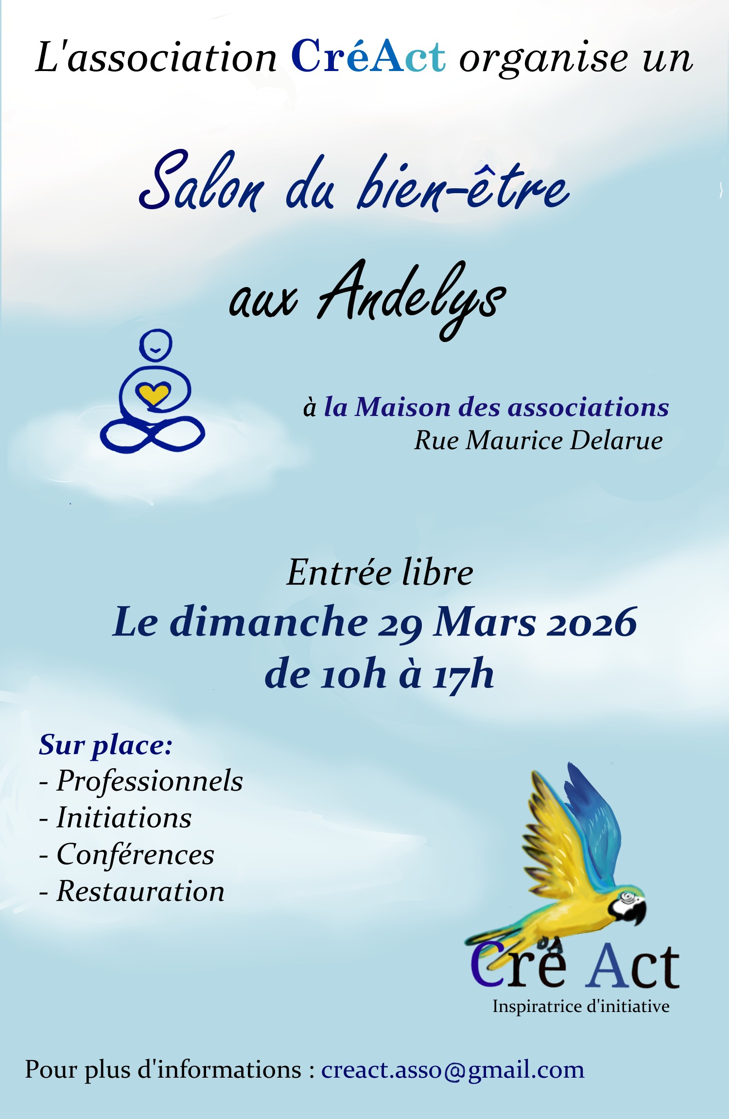 Dimanche 29 mars de 10h00 à 17h00 à la maison des associations, l'association CréAct vous propose une journée détente. Sur place, vous trouverez des professionnelles, des initiations, des conférences et de la restauration. Entrée libre Pour plus d'informations : creact.asso@gmail.com |