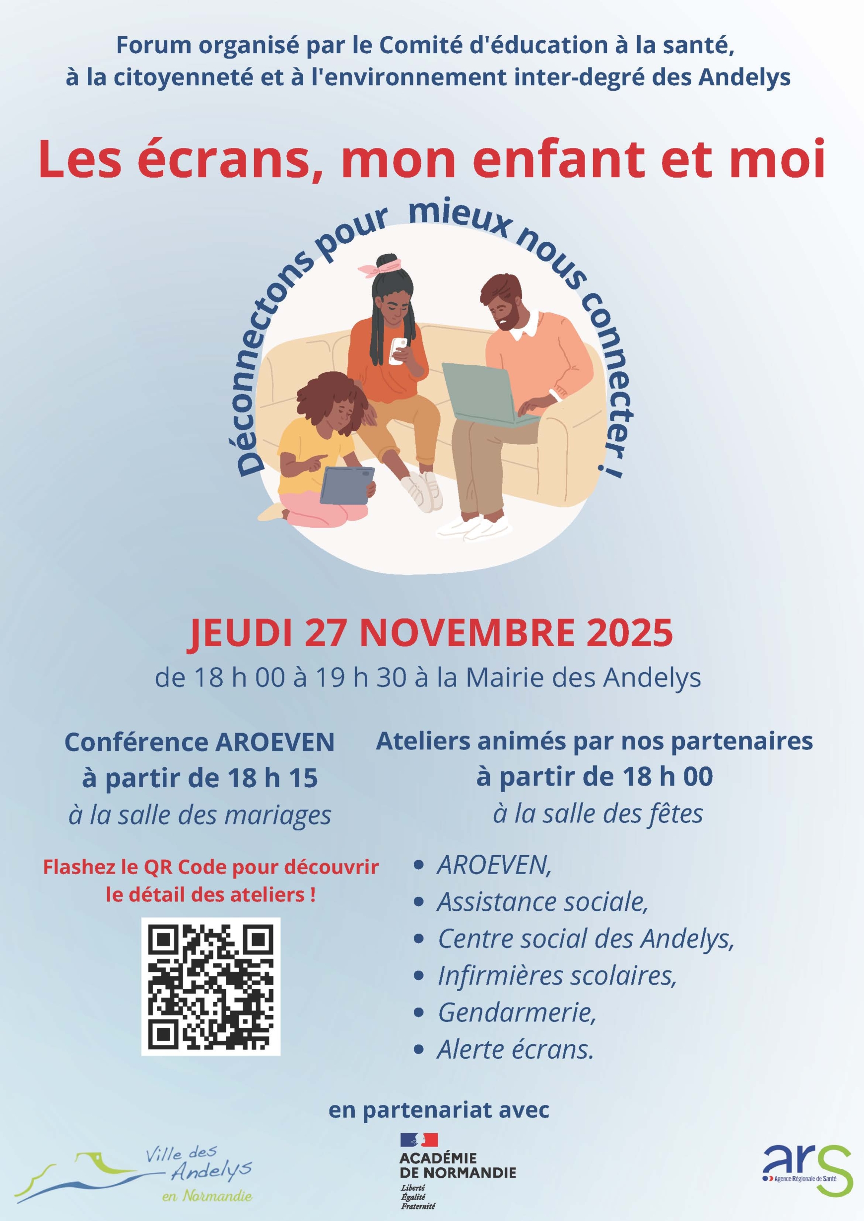 Mairie des Andelys Avenue du Général de Gaulle, LES ANDELYS, FranceForum : « Déconnectons pour mieux nous connecter ! » La Ville s’engage avec le Comité d'éducation à la santé, à la citoyenneté et à l'environnement inter-degré. Nous vous attendons le jeudi 27 novembre à 18h00 à la Mairie des Andelys (Av de la République). Au programme : Un forum-conférence et des ateliers à destination des [...]