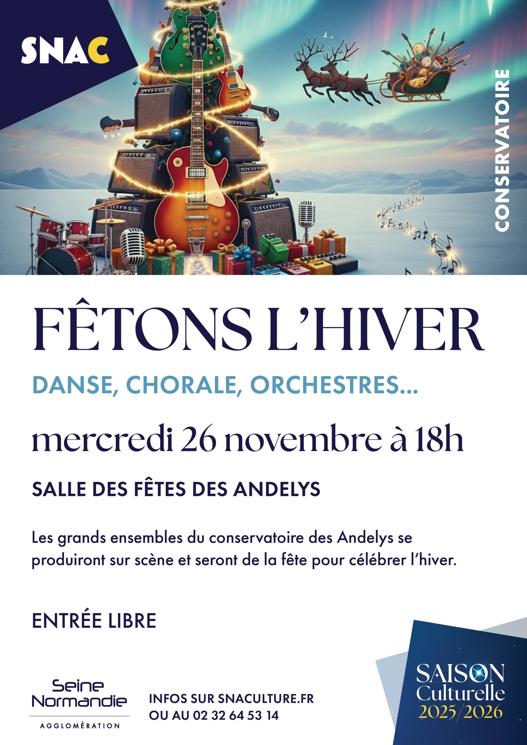 Salle des Fêtes des Andelys 28, avenue du Général de Gaulle, Les Andelys, Eure, FranceMercredi 26 novembre à 18h00 à la salle des fêtes des Andelys, Seine Normandie agglomération pour propose le spectacle « Fêtons l'hiver » (danse, chorale, orchestre...) Les grands ensemble du conservatoire des Andelys se produiront sur scène et seront de la fête pour célébrer l'hiver. Entré gratuite Pour plus d'informations : snaculture.fr / 02 32 64 [...]