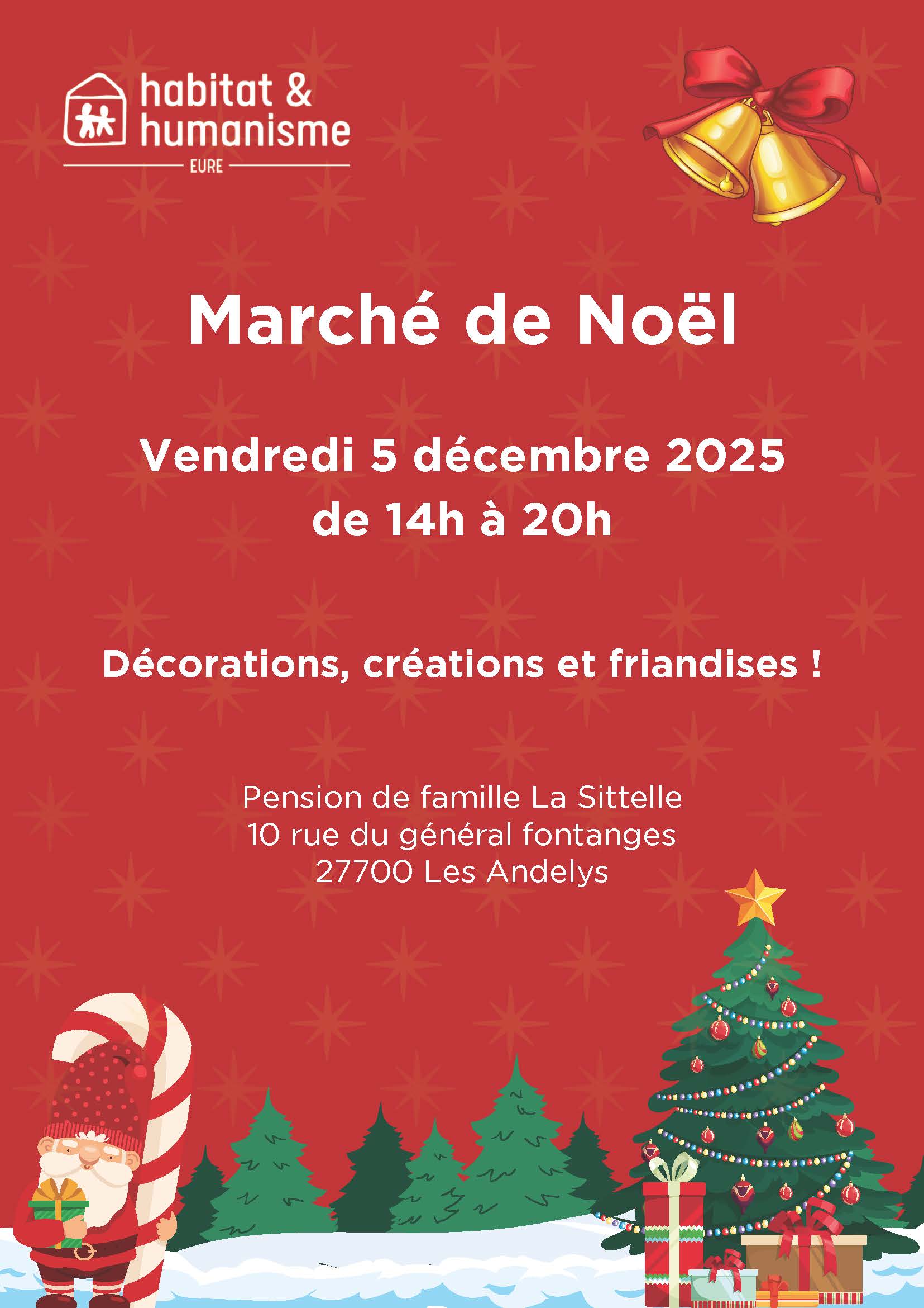 Résidence La Sittelle 10 Rue du Général Fontanges, Les Andelys, Eure, FranceHabitat & Humanisme Eure vous propose un marché de Noël, vendredi 05 décembre de 14h00 à 20h00 à la résidence « La Sittelle » (10 Rue du Général Fontanges). Décorations, créations et friandises.