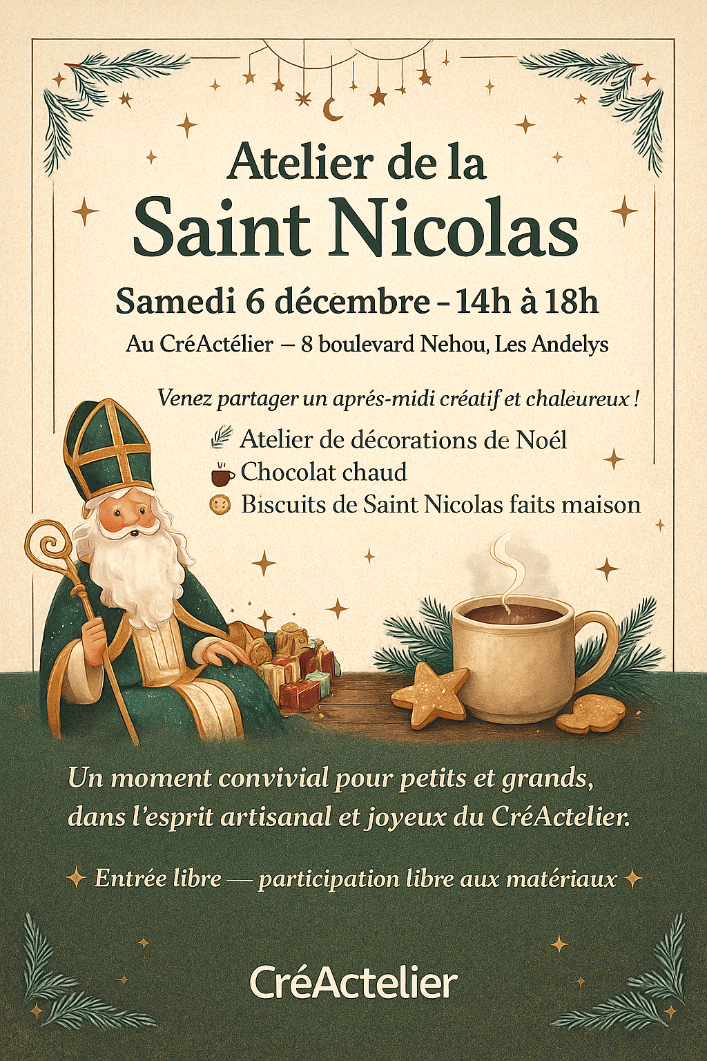 8 Boulevard Nehou 8 Boulevard Nehou, Les Andelys, Eure, FranceLe CréActelier ouvre ses portes pour un après-midi chaleureux et festif le samedi 06 décembre, à partir de 14h00 au 8 Boulevard Nehou. Venez partager un moment convivial autour de biscuits et de boissons chaudes avant de participer à un atelier créActif encadré par Laye N'diaye. Entrée libre