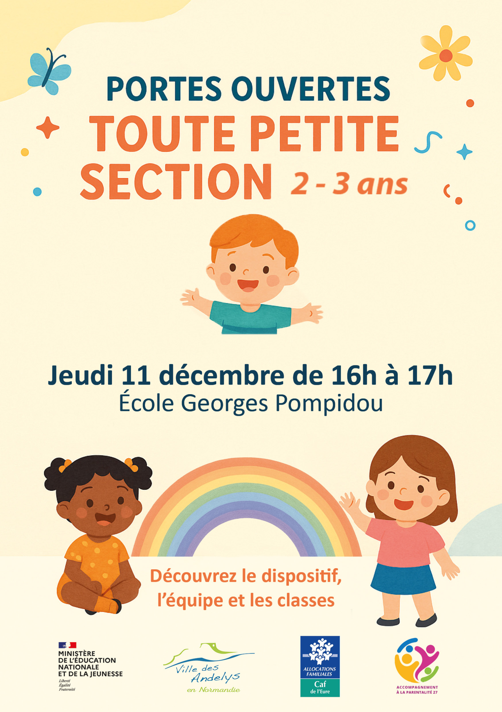 École Georges PompidouJeudi 11 décembre de 16h00 à 17h00, l'école Georges Pompidou vous propose des portes ouvertes pour la Toute petite section destinée aux enfants âgés de 2 à 3 ans. Venez découvrir le dispositif, l'équipe et les classes. Pour les enfants : Se familiariser avec l’école Permettre aux enfants d’éprouver le plaisir d’apprendre Développer son langage Accompagner [...]